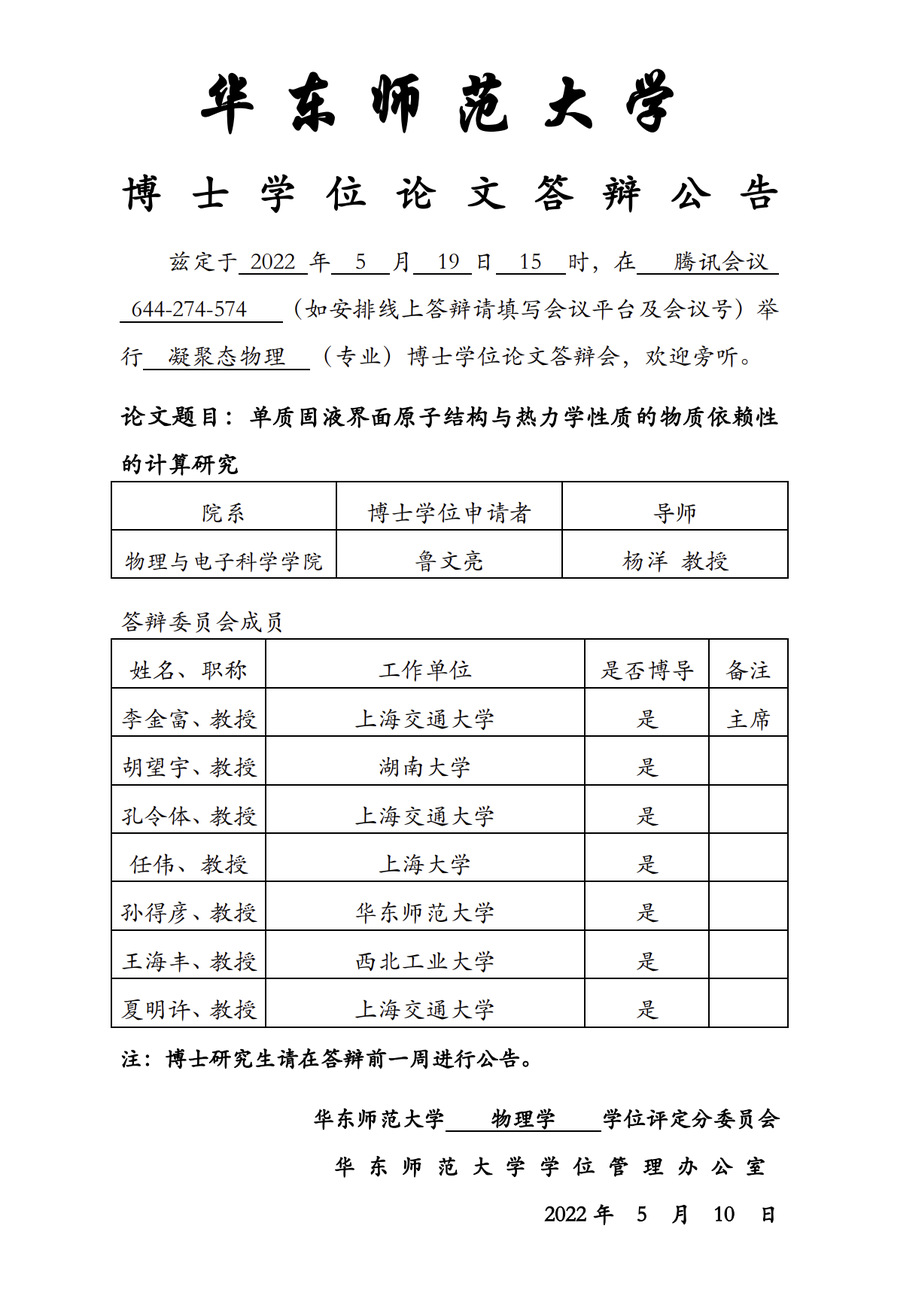 华东师范大学 博士学位论文答辩公告-鲁文亮