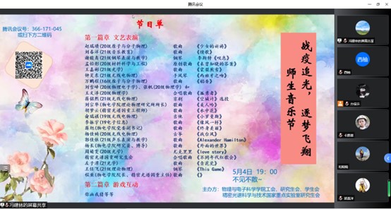 在学校封闭管理期间,为丰富同学们的学习生活,学院团委积极筹备组织“追光”音乐节,四月份先后举办了两场“云”文艺晚会。5月4日晚7点,在学院师生的热切期待下,由学院工会、研究生会、学生会、精密光谱国重实验室研究生会联合举办的第3期音乐晚会开场,晚会由电子系硕士研究生冯建林、本科生梁菡洋、精密光谱国重实验室硕士研究生王昌文共同主持。