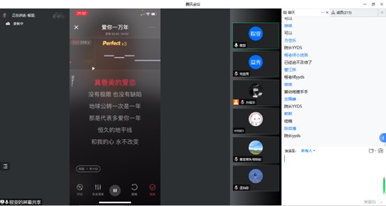 理论物理研究所所长刘宗华,精密光谱国重实验室胡梦云,学院党委副书记蒋旭,极化材料与器件教育部重点实验室副主任杨长分别演唱,引起了同学们的点赞。学院党委副书记、精密光谱国重实验室党总支书记郑利娟在发言中谈到,通过云晚会,感受到了学院师生的热情参与和精彩表演,希望大家把这样的热情和活力带入学习、科研和生活中。