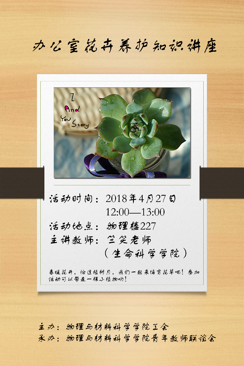 四月春暖雨润,正是植树种花好季节。2018年4月28日中午,华东师范大学物理与材料科学学院工会、青年教师联谊会,在物理楼227联合举办办公室花卉养护知识讲座活动,物理与材料科学学院青年教师联谊会副理事长柴志方老师出席本次活动。