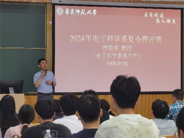 唐晓东为夏令营致辞,他强调了科技创新的重要性,鼓励所有营员积极求问、探索新知,在夏令营中有所收获。随后,电子科学系副系主任钟妮介绍了电子科系的教学资源、科研成果以及未来的发展方向,加深了营员们对电子科学系前沿领域和学术特色的了解。