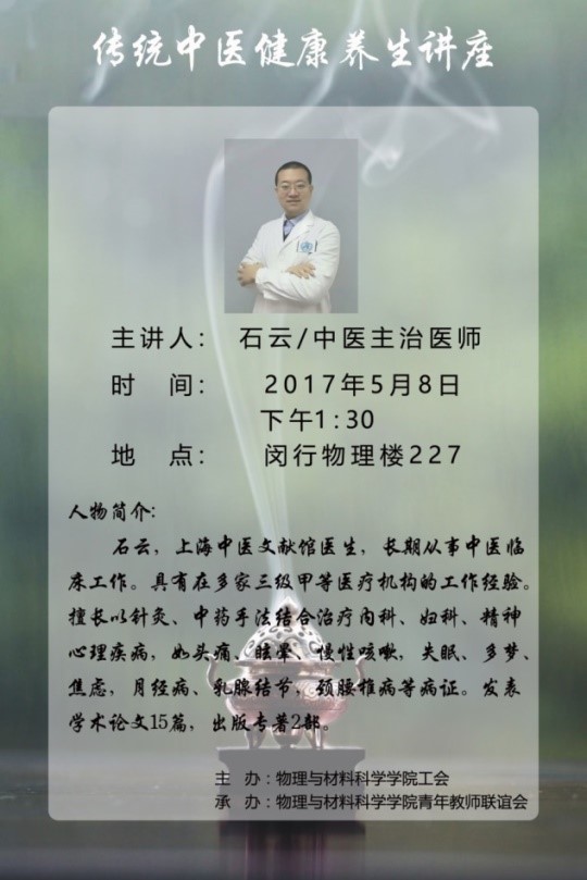 本次活动物理与材料科学学院工会主办,由青年教师联谊会承办,于2017年5月8日下午1:30分在闵行物理楼230室进行。我们邀请到了中医文献馆的石云中医主治医师,为老师们传播中医养生之道。工会主席马红梅老师出席本次活动。石老师将主讲内容分四个大块进行详细解说,包括中医自述、中医的沿革、中医主要理论、养生知识。就教师常见的职业病如:咽喉炎、腰脊椎病、睡眠问题、高血压、妇科问题、甲状腺结节等常见病症进行中医角度的分析和预防。石老师特地用浅显易懂,风趣生动的语言将案例讲给物理老师听,长达一个半小时的讲座让人感到受益匪浅。讲座环节结束,紧接着是有问必答环节。在座的每一位老师从自身的身体状况以及孩子养育中的遇到的一些问题提出了自己的疑惑,场面非常活跃。石老师非常耐心地逐一解答大家提出的各自的问题。石老师还特意为前来听课的老师们精心准备了自制的香囊等小礼物赠送给大家。
