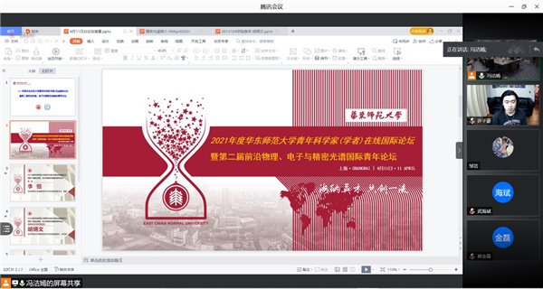 4月11日,华东师范大学第二届前沿物理、电子与精密光谱国际青年科学家(学者)论坛在闵行校区物理楼三楼多功能厅举行,来自美国、新加坡、瑞典、德国等国家的12名青年学者参会。论坛由学院院长程亚主持。
