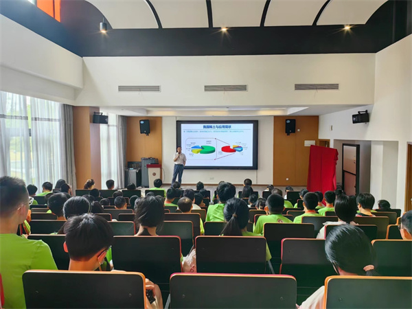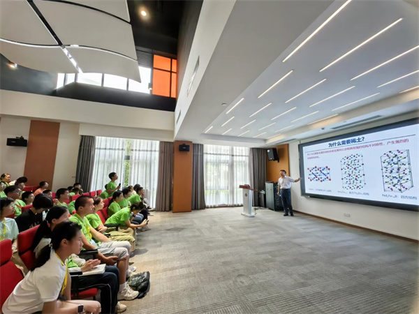 开营仪式结束后,物理营以专家主题报告开启“追光之旅”。国家自然科学基金优秀青年基金项目获得者詹清峰教授作“无处不在的稀土永磁材料”主题报告。他聚焦稀土磁性材料资源分布与开发、发展历史与趋势、发展前景与应用等方面进行了深入浅出的讲解,并与小营员们进行了热烈互动。