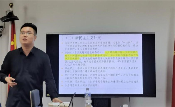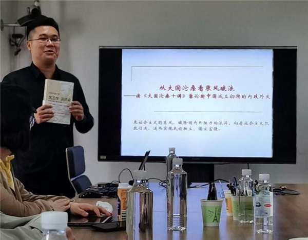 王元力通过分享《大国沧桑十讲》的读书体会,讲述了中华人民共和国成立后,中国共产党领导全国人民破除国内外阻力,建设新中国的历史,简述了在建设新民主主义社会时期,中国共产党领导中国人民谋求国家富强和人民幸福的奋斗历程。王元力还重点介绍了中华人民共和国成立初期的内政外交政策、中苏同盟的建立和破裂、抗美援朝战争等历史事件,并谈到:历史充分证明,只有中国共产党才能救中国,也只有中国共产党才能发展中国。只有认识到中国共产党领导人民建立中华人民共和国、探索新民主主义社会的历史进程“不容易”“不简单”,才能做到学史明志“不忘却”,知史力行“不分离”。