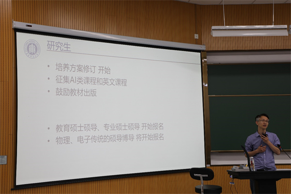 副院长胡炳文通报培养方案修订、博士生名额分配情况,鼓励教职工积极参与AI类课程和英文课程建设。