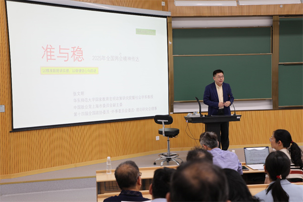 第十四届全国政协委员、中国致公党上海市委员会副主委、华东师范大学国家教育宏观政策研究院暨社会学系教授张文明应邀作《“准与稳”——2025年全国两会精神传达》主题报告。