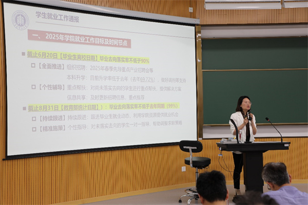 党委副书记栗蕊蕊通报2025年学院就业工作、实验室安全工作情况,动员导师关切支持毕业就业工作。