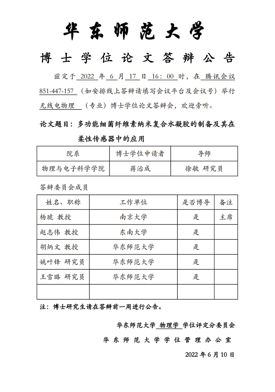华东师范大学 博士学位论文答辩公告-蒋治成