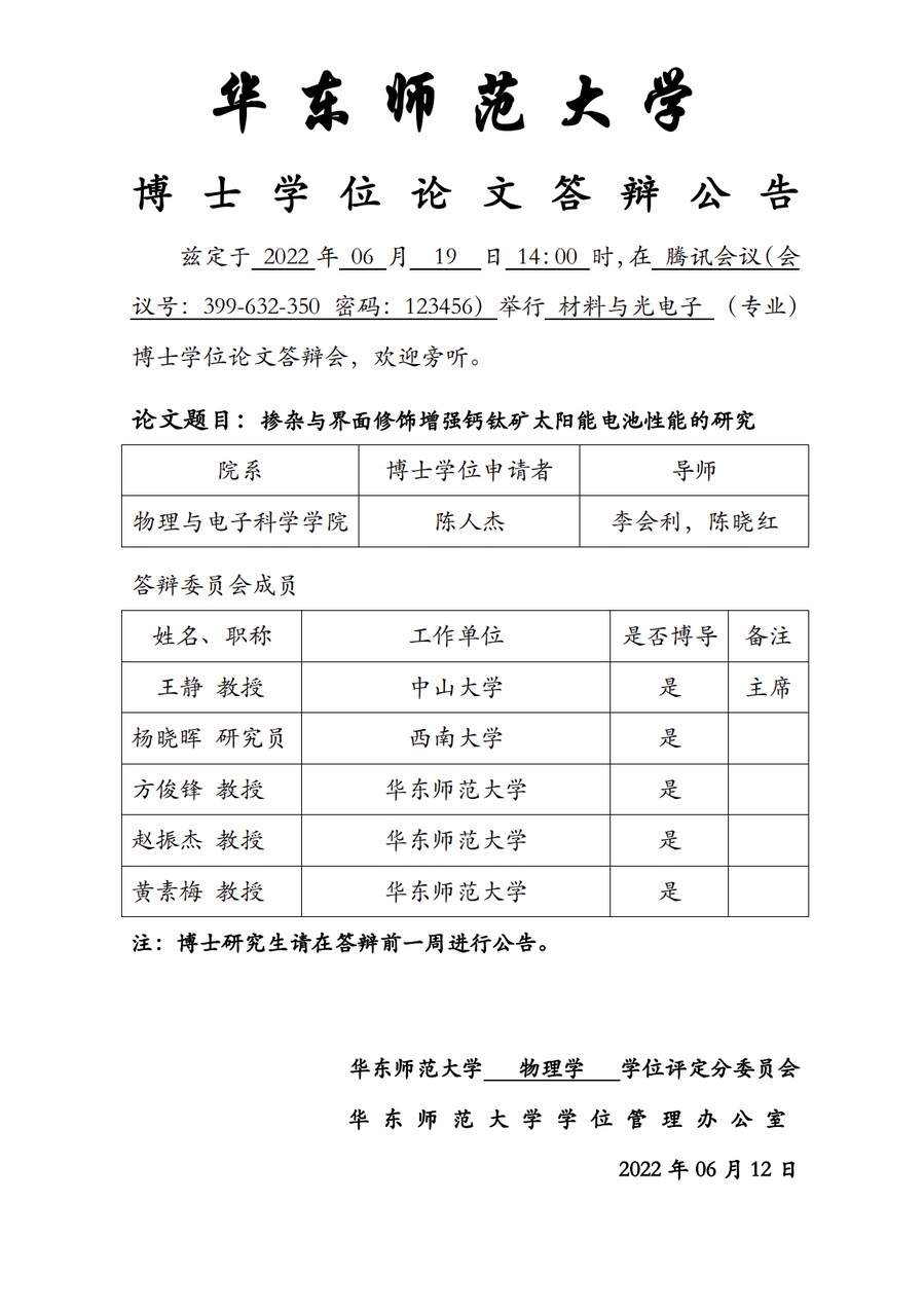 华东师范大学 博士学位论文答辩公告-陈人杰