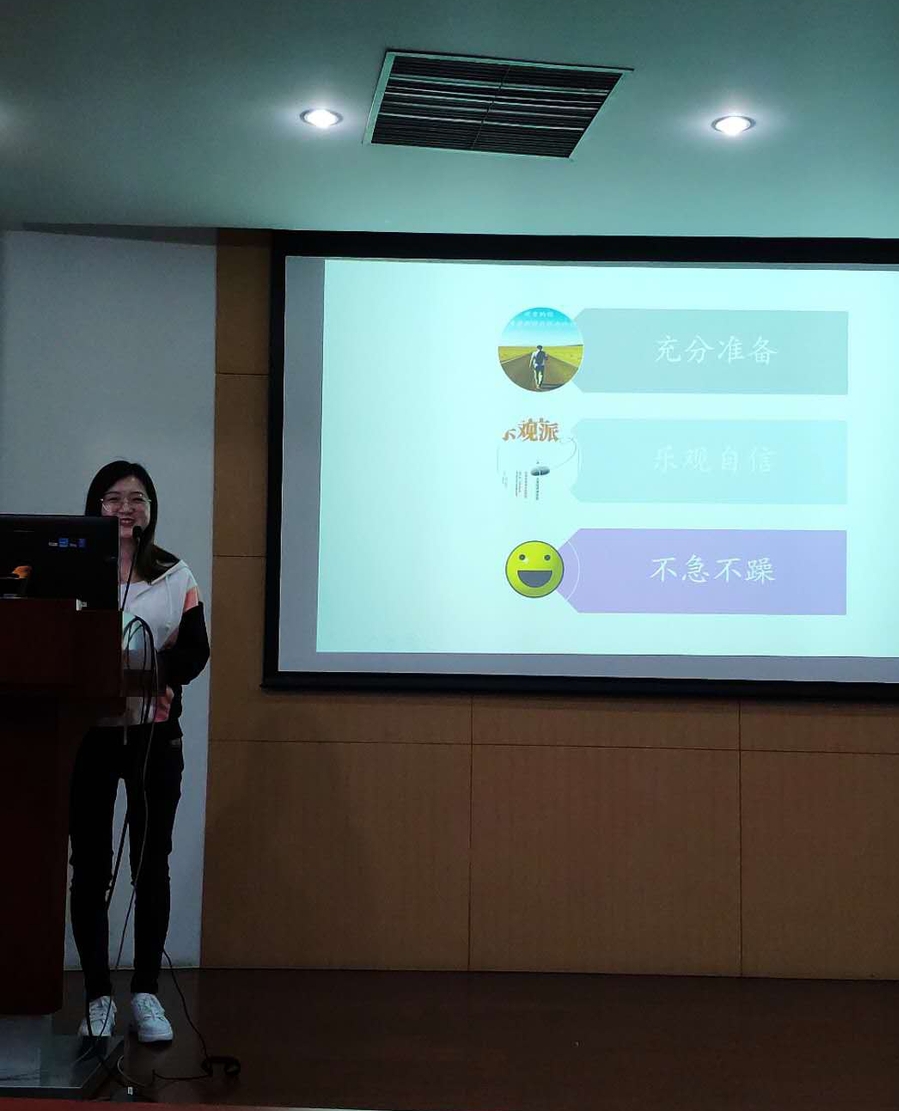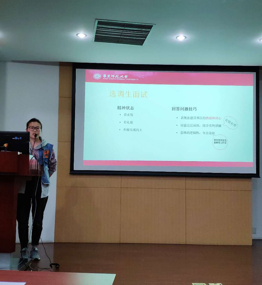 接下来就是正式经验交流会。第一位分享经验的是生物物理的鲁露,她签约了上海静安区的中学,耐心的讲述了上海教师招聘的一系列环节,无论是前期的充分准备,比如简历制作、教材熟悉、等,还是后续的教师招聘流程,像报名时间的关注、教师考试等,这些信息都为以后想留在上海工作的同学提供了宝贵的经验。