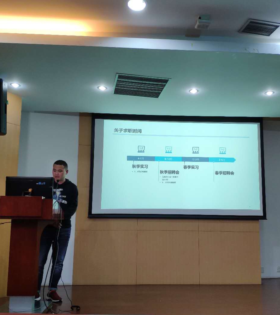 正式经验交流会开始前,聂树伟老师为大家介绍了2019届各专业同学的就业情况,使同学们对就业形势有了大体的了解,并对就业协议书的使用、上海落户政策、毕业论文的按时完成等注意事项进行了讲解。