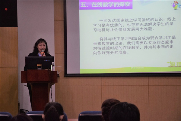 讲座伊始,汤军琳围绕疫情期间的中学教学实例,介绍了主题为“在线教学的探索”的教研案例。疫情期间的空中课堂与针对教学相结合,复课后线上线下结合的混合式教学让同学们眼前一亮。她建议同学们注重提前备课、注重学生的兴趣性、注重学生手中的文本材料。她指出,在停课不停学期间,新教师的教学能力和老教师的信息技术能力都受到了突发事件的考验,不论新教师还是老教师,都需要树立应对突发事件的意识,不断完备自己的能力,以保证在各种条件下都能推进教学。