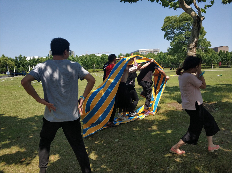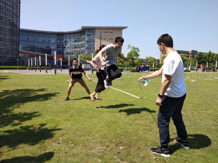 运动会的项目有七个:数数几只脚、车轮滚滚、跳长绳、企鹅漫步、蒙眼摸树、跳跳袋鼠、枪林弹雨。每4人成立一个小组,三个年级不同专业的同学们都参加到了游戏中来。