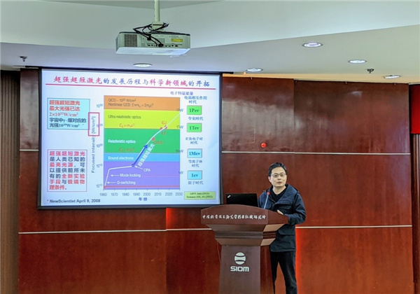 通过介绍短片,同学们对光机所的历史发展与机构组成、科研成绩和学术地位有了初步地了解。强场激光物理国家重点实验室的刘鹏研究员对同学们的到来表示欢迎,他介绍了超强超短激光这一科学研究领域的学科背景和发展方向,并展示了实验室历年来在该方向取得的科研成果。
