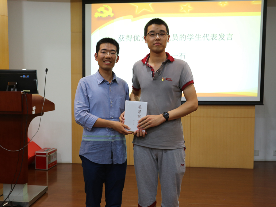 会议伊始,胜游体育党委副书记黄岚兰老师宣布了表彰决定及获奖名单。其中2016年度优秀共产党员为包括张杰老师在内的二十位党员同志,2016年度优秀党务工作者为包括林一石同学在内的五位同学。这些同学和老师在过去的一年中起着积极地模范带头作用,为党员同志们树立了良好的榜样。颁奖结束之后,优秀共产党员的教师代表张杰老师,优秀共产党员的学生代表林一石同学均进行了发言。他们与在座的党员交流了一年工作、学习的感悟,林一石同学讲述了自己入党的心路历程,并在毕业之际代表本科生党支部想党委赠送《毛泽东文集》一套。
