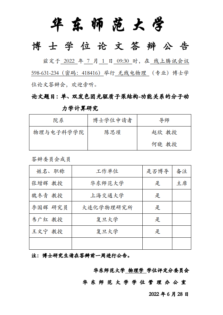 华东师范大学 博士学位论文答辩公告-陈思瑾