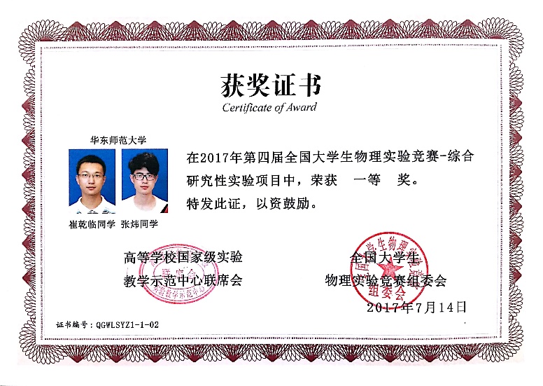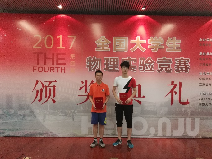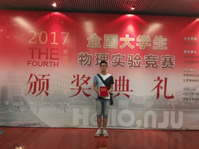2017年7月12日,由高等学校国家级实验教学示范中心联席会主办,全国高校实验物理教学研究会和江苏省高校实验室研究会协办,南京大学物理学院和江苏省物理学会承办的第四届全国大学生物理实验竞赛在南京大学仙林校区举行。经过两天的激烈角逐,胜游体育14级本科生崔乾临与张炜同学获综合研究性实验项目一等奖,15级本科生石佳辰同学获基础性实验项目二等奖,15级本科生戴羽同学获基础性实验项目的入围奖。