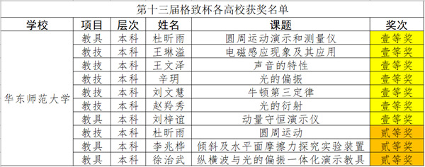 学院物理师范教育教学中心教师刘金梅、尹亚玲、陈廷芳、柴志方、赵强、崔璐、陈丽清、徐敏分别荣获“优秀指导教师”称号,华东师范大学荣获“优秀团体奖”。