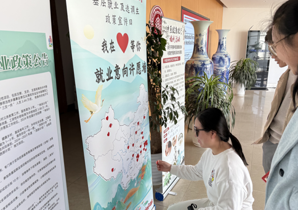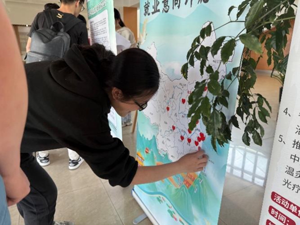 活动现场,一幅以中国地图为背景的“我在等你”主题寄语墙成为焦点。参与者手持心愿贴,带着对未来就业的憧憬,将贴纸郑重粘贴至地图上的目标区域。