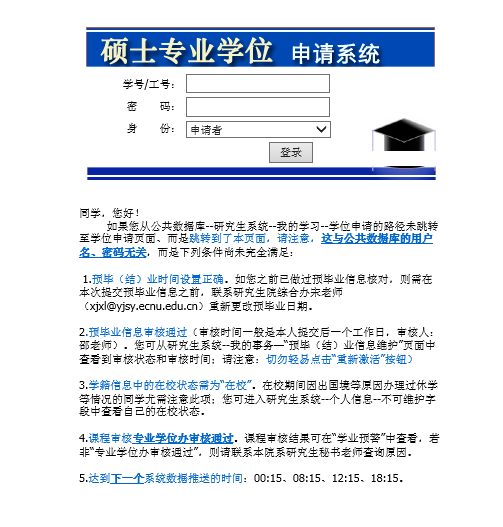 答辩资格审核工作在学位申请系统中完成,研究生可登陆学位申请系统的前提需要同时满足以下三个条件: