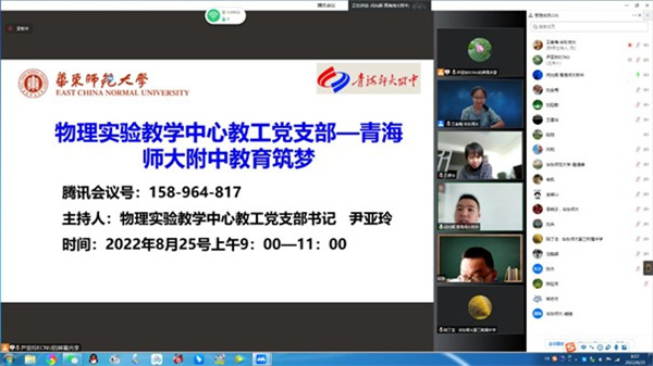 2021年3月起,物理实验教学中心教工党支部牵手青海师大附中物理备课组,开启“教育筑梦”计划已有一年有余。一年多来,物理实验教学中心教工党支部立足中心教育资源优势,从对方的实际教学需求出发,积极组织开展云参观实验室、仿真实验授课、物理教学研讨等形式多样的交流活动,不仅与青海师大附中师生建立了深厚的友谊,也为其物理教育教学源源不断地贡献着“师大力量”。