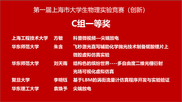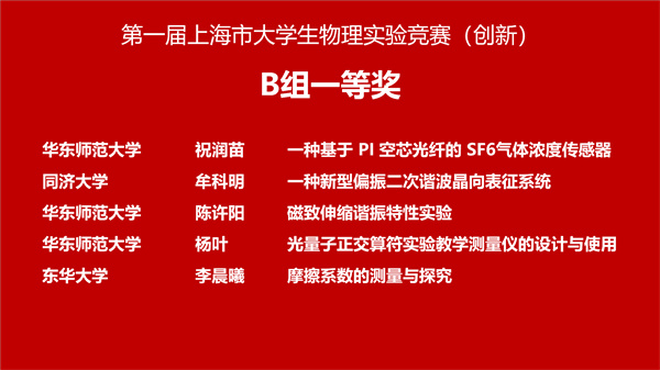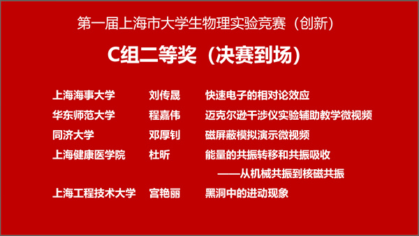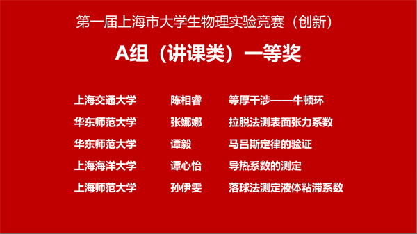 8月26-27日,第一届上海市大学生物理实验竞赛(创新)决赛在复旦大学恒隆物理楼举行。经过预赛评审,全市共有15所高校的30个作品入围决赛,我校选派的8个作品全部入围。经过激烈角逐,我校最终获得一等奖7项、二等奖1项。