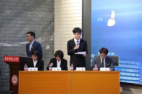 学院“物理追光”辩论队持正方观点:“当今时代,弘扬传统文化应以传承为重”,古美路街道“古美扬帆”持反方观点:“当今时代,弘扬传统文化应以创新为重”。