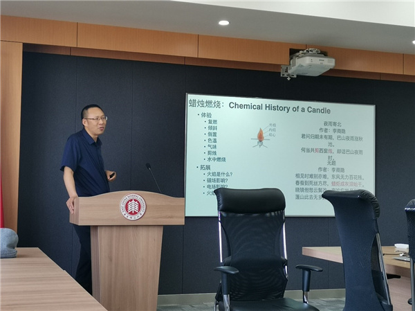 张增明作题为《培养学生创新能力的实验课程体系探索》的报告。他认为,要让学生掌握物理量的测量方法、仪器使用、实验技能和数据处理;引导学生运用物理原理解决实际问题,学习物理学研究的基本方法。他强调,物理实验内容不能一成不变,根据生活中的现象设计一些新颖的实验,更能激发同学们的积极性。最后,他以“水滴对植物光合作用的影响”为例,分享了实验课程体系建设的经验。