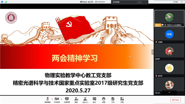 5月27日晚,物理实验教学中心教工党支部与精密光谱科学与技术国家重点实验室2017级研究生党支部联合开展“学习两会精神”线上主题党日活动。会议由物理实验教学中心教工党支部书记尹亚玲主持。