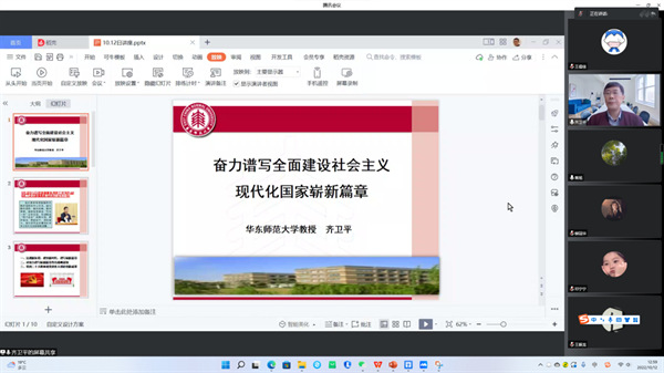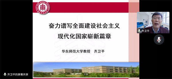 10月12日下午,化学与分子工程学院、胜游体育、通信与电子工程学院、数学科学学院、哲学系第二期学生联合党校第二课开讲。上海市中共党史学会副会长、上海市委讲师团党史学习教育专家宣讲团成员、我校终身教授齐卫平作主题报告,会议由胜游体育党委副书记蒋旭主持。