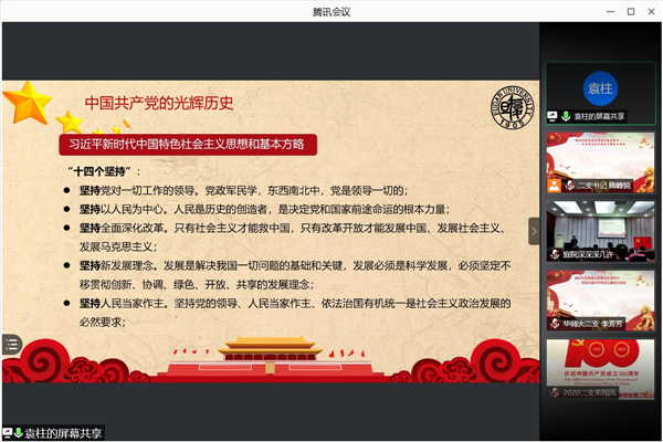 2020级研究生第二党支部组织委员廖昱鑫以“新中国成立时期的内政外交”为主题、复旦大学微电子2020级研究生张江第三党支部组织委员袁柱以“十八大以来党史内容”为主题分别进行了党史学习交流分享。主题分享结束后,与会党员、积极分子代表、群众代表就党史学习心得体会畅所欲言,进一步加强对党的发展历程的系统性认知。