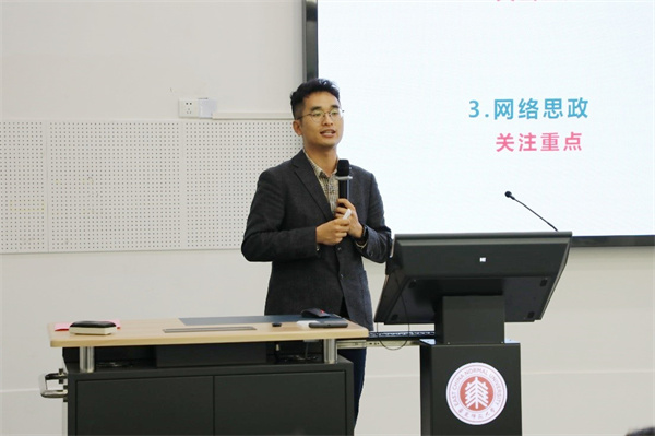 孟宪承书院辅导员石玉帛通报2023学年秋季学期物理专业师范生卓越成长情况。他从物理师范基本情况、双院协同育人特色、年级重点工作、学期计划等方面进行介绍,并对学院支持师范生卓越成长的各项举措表示感谢。
