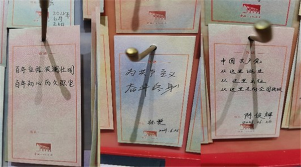 参观结束,支部党员纷纷提笔在卡片上提笔留言,向党送去最真挚的美好祝愿。