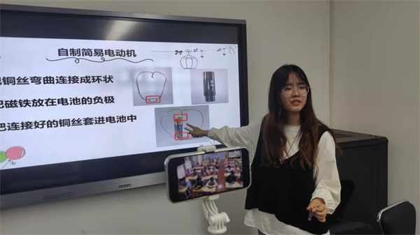 在课堂上,王媛回顾了能量守恒定律和机械能守恒定律,通过“旋转铜线圈”的视频,细致讲解了自制简易电动机的构成原理,之后,王媛和童欣通过视频教学,引导同学们一步步制作简易电动机,通过问答形式,逐步讲解实验要点难点。完成实验后,王媛和童欣针对部分同学实验失败的情况,进行了详细的指导。同学们通过线上指导、线下动手的方式,对简易电动机实验的原理、操作有了深入的了解。