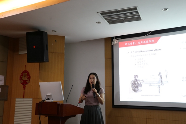 贾丛尔同学聚焦《基于光学透明化技术的活体光声显微镜成像研究》,创新性地结合光声显微成像(PAM)与光学透明化技术(TOC),实现了对活体深层器官的无损、高分辨率直接观测。其展示的小鼠耳部微血管网络高清成像结果,清晰直观,引发了与会师生对技术应用前景的热烈探讨。