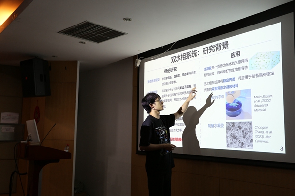 周文皓同学的《双水相系统研究》从双水相系统的分子动力学模拟和实验验证出发,并将研究成果应用于柔性水凝膜材料的相嵌入式3D打印和肌电传感器领域。