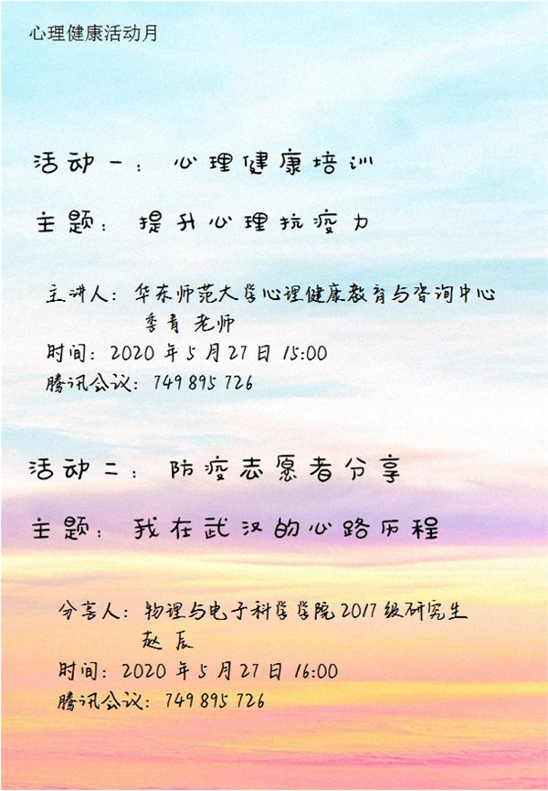 华东师范大学心理健康教育与咨询中心季青、胜游体育2017级材料与光电子专业研究生赵辰同学应邀参加心理健康月活动,通过线上会议形式普及心理健康知识、分享“战疫”新路历程,共有200余名师生参与活动,活动由本科生辅导员黄蕊主持。