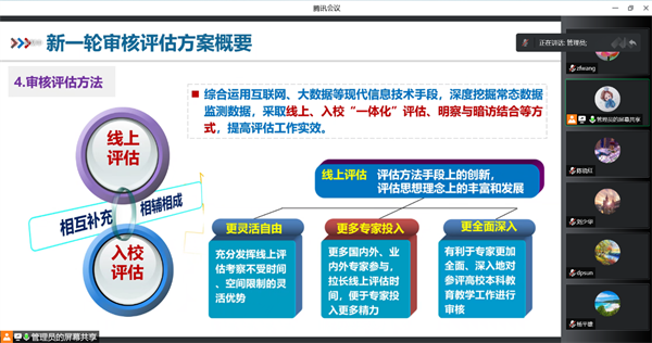 教育部新一轮本科教育教学审核评估在即,为落实评估要求、抓好内涵建设、开展规范检查,全方位做好自评自建工作总结和支撑材料提交工作,4月13日下午,学校教务处副处长周先荣教授应邀作教学评估指导。学院教学委员会委员、本科教学管理团队,以及百余位任课老师线上线下参会。会议由学院副院长徐敏主持。
