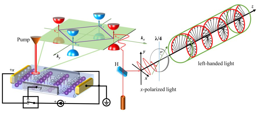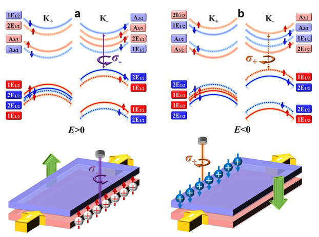 在具有自发谷极化的TMDC中,通过特殊的层间耦合设计,他们提出一种双层反铁谷体系,从而实现了电控反常谷霍尔效应[2]。k·p模型和第一性原理计算显示,这种调控机制实现的关键在于谷间的能级简并度可以通过外加垂直电场来进行可逆操纵。在不施加外场时,由于两个单层之间的反铁谷耦合,谷间的能带结构是能级简并的,此时的体系具有空间反演对称性,不存在反常的谷霍尔效应。当施加一个外加电场时,体系中引入的层间电势差导致原有的空间反演对称性被打破,层间子带将发生相对移动,从而打破谷间的能级简并度,最终导致反常谷霍尔效应的发生。不同于铁谷单层中谷极化起源于内禀交换作用,在反铁谷双层结构中,谷间的能级简并度取决于外加电场手段的调控,谷间的能级劈裂和反常谷霍尔效应中霍尔电压的符号均依赖于外加电场的方向。考虑到反常谷霍尔效应本身是电可探测的,因此,在这个双层体系中就可以通过电场的手段调控和探测反常谷霍尔效应,为实现全电学读写存储器件提供了一个具有潜力的平台。以上工作发表于Nature集团新创立的合作期刊《量子材料》上[npj Quantum Materials 2, 47 (2017)]。