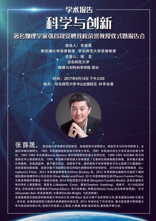 张首晟,斯坦福大学物理系讲席教授,美国国家科学院院士, 美国艺术与科学学院院士, 中国科学院外籍院士。1983 年获德国柏林自由大学学士学位,1987 年获纽约州立大学石溪分校博士学位,1987-1989 年任美国Santa Barbara 理论物理研究所博士后研究员,1989-1993 年任IBM 阿尔玛登研究中心高级研究员,1993 年受聘于斯坦福大学物理系。主要研究领域凝聚态物理,其中重点是拓扑绝缘体,在高温超导、量子霍尔效应、自旋电子学、强关联电子系统等研究方向上取得了大量国际一流的原始创新成果。因其对量子自旋霍尔效应和拓扑绝缘体的开创性研究,2010年获欧洲物理奖 (Europhysics Prize),2012 年获美国物理学会Oliver Buckley 奖,2012 年荣获联合国教科文组织下属的国际理论物理学中心狄拉克奖 (Dirac Medaland Prize), 2013 年获物理前沿奖(Physics Frontier Prize),与著名物理学家霍金一起登台领奖。 2014 年荣获富兰克林奖 (Benjamin Franklin Medal)。该奖历届得主有科学巨人爱因斯坦,居里夫人(Madame Curie),霍金(Stephen Hawking),杨振宁,与116位诺奖得主, 还有发明大师爱迪生(Thomas Edison,电灯发明者), 特斯拉(Nikola Tesla,交流电网发明者),贝尔 (Alexander Bell, 电话发明者) 与莱特(Orville Wright,飞机发明者).