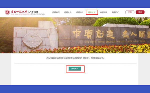 (1)校外申请人输入:www.jobs.ecnu.edu.cn,选择“青年论坛”板块,进行青年论坛在线报名。