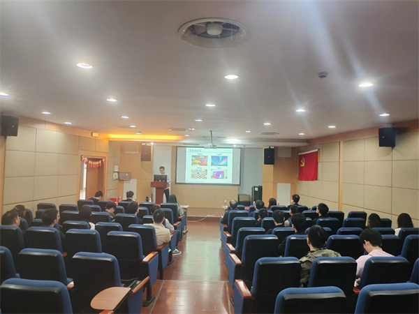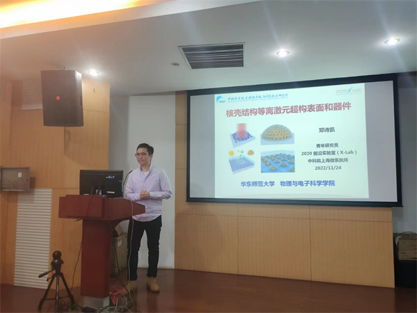 邓诗凯作题为《核壳等离激元超构表面与器件》的学术报告。报告中,他从金属纳米颗粒阵列制备以获取极窄的等离激元共振、金属纳米颗粒表面化学调控纳米激光、核壳纳米阵列结构实现高效光电催化增强等三个方面与参会师生进行了深入交流。