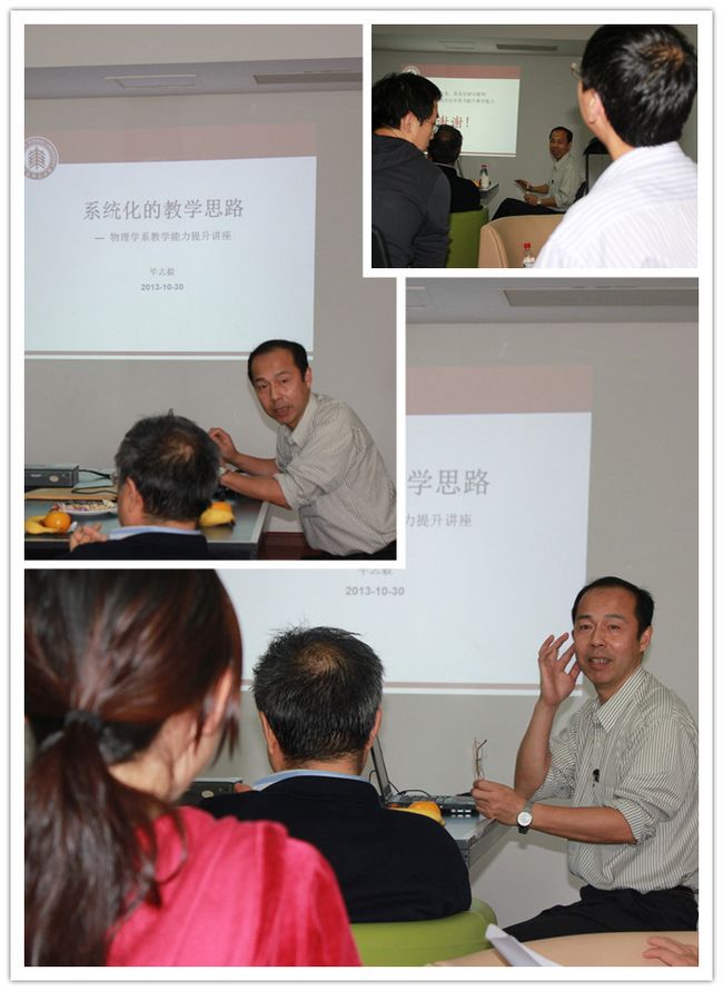为提升物理学系老师的教学能力,在华东师范大学教务处教师教育发展中心的支持下物理学系于20131030日下午于闵行校区物理楼227室举办了教师教学能力提升讲座及交流活动。讲座及交流活动由物理学教学主任王向晖老师主持,物理学系主任黄国翔老师致开场词,物理学系书记马学鸣老师、物理学系科研主任徐敏老师、物理学系教学督导朱鋐雄老师及华东师范大学广大老师参加讲座活动。