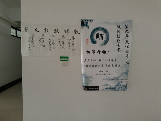 这是一场强者与强者的对决。紧张的气息在赛前就已弥漫在整个第四教学楼,选手们早早来到了赛场,有的在黑板前试讲,有的在整理自己的着装,有的在对讲课内容进行最后一次的调整,只为在比赛中展现一个完美的课堂。