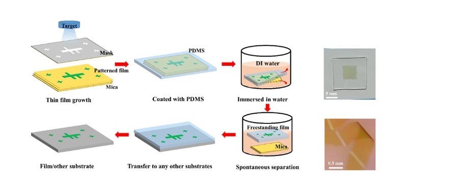 可转移的自支撑薄膜的制备方法(左)及获得的厘米级自支撑薄膜(右)