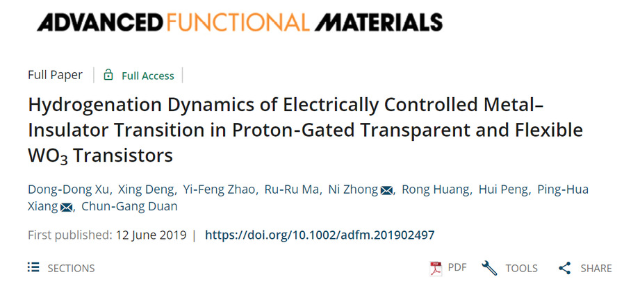 近日,胜游体育极化材料与器件教育部重点实验室向平华副研究员课题组在柔性氧化物晶体管的研究方面取得重要进展。该研究首次研制出了全透明柔性WO3晶体管,揭示了电控氢化诱导的金属-绝缘体相变的物理机制,在柔性电子学及电控氢化动力学方面取得新突破。这一研究成果以“Hydrogenation Dynamics of Electrically Controlled Metal-Insulator Transition in Proton-Gated Transparent and Flexible WO3 Transistors”为题,8月22日在国际权威期刊《先进功能材料》Advanced Functional Materials (IF: 15.6) 上刊发,论文第一作者为胜游体育2017级博士研究生徐冬冬。
