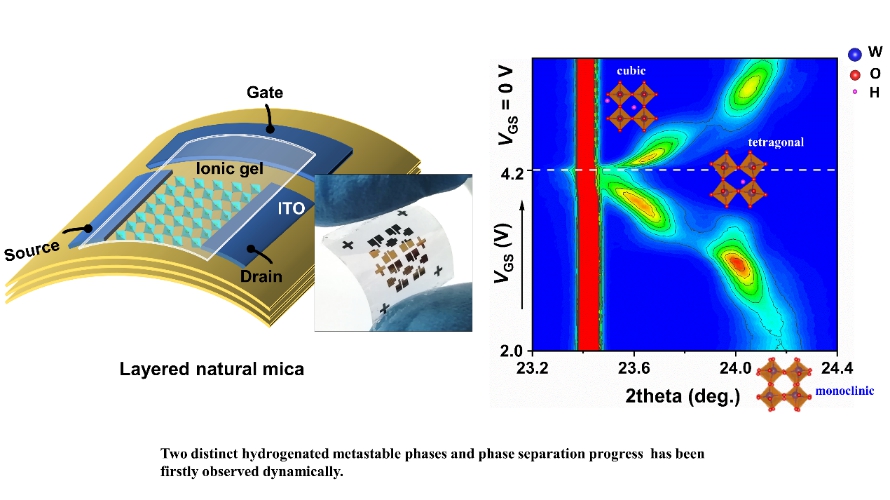 基于这一思路,该研究利用范德华外延技术在天然云母衬底上实现了高质量WO3薄膜的生长,同时采用新型的自支撑离子凝胶膜作为栅介质,成功制备了全透明柔性场效应晶体管。在该晶体管结构基础上,向平华副研究员课题组在实验上首次观测到氢化WO3的两种亚稳相以及其相分离过程,并在WO3薄膜中实现了电场诱导的高可控金属-绝缘体相变。通过与段纯刚教授团队合作,借助第一性原理计算,揭示了金属-绝缘体相变过程中伴随着氢化WO3结构相变的微观动力学过程,为设计和开发基于金属-绝缘体相变的器件提供了强有力地指导。