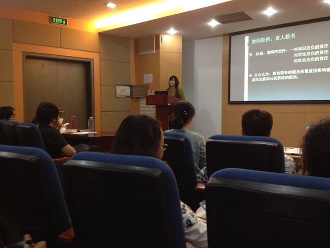袁老师首先介绍了教师职责——教书育人,指出教师的责任应该分为三个方面:对知识应负的责任、对学生应负的责任、对社会应负的责任。袁老师还从自己的成长感悟中提出了她对于教师底线和原则的认识。袁老师强大的人格魅力和流畅的演讲风格让同学们都聚精会神地聆听、思考。