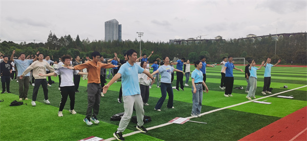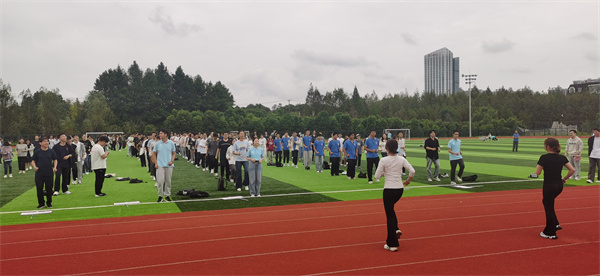 体育与健康学院健美操队队员赵雅婷、岳悦领跳热身舞。师生们纷纷舒展身姿,为趣味运动会拉开序幕。